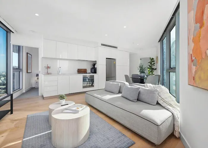 Die 60 m² große Ferienwohnung Prime Southbank Location 2 Bdm, Pool, Gym Melbourne City in Melbourne City befindet sich ca. 2 Kilometer vom Etihad Stadium und weniger als 25 Gehminuten vom Cook's Cottage entfernt.